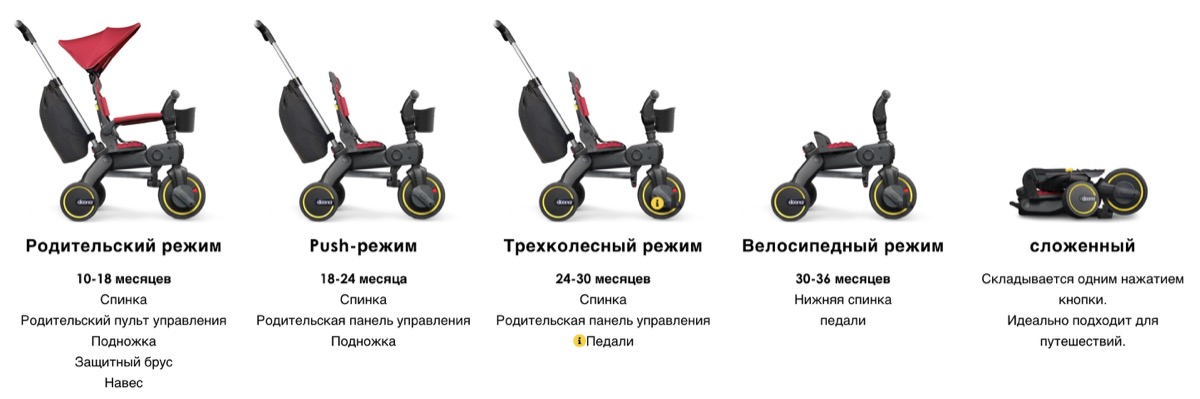 * 30+ месяцев: Рукоять и высокая спинка удаляются, Doona Liki Trike S5 превращается в полноценный трехколесный велосипед.